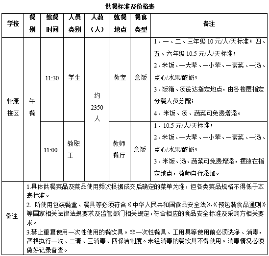 项目概况 常州市怡康小学用餐配送服务项目 的潜在投标人应在常州市恒卓建设工程管理咨询有限公司综合办获取招标文件,并于2022年07月28日下午15点00分(北京时间)前递交投标文件。 一、项目基本情况 1.项目编号:恒卓采标(2022)079号 2.项目名称:常州市怡康小学用餐配送服务项目 3.最高限价:/ 4.采购需求:本项目为常州市怡康小学用餐配送服务项目,供应商主要负责日常学生及教职工的用餐加工配送服务,即:协助采购人制定每周带量菜谱,按制定的菜谱,组织提供师生用餐的加工、配送、分餐等服务。包括但不限于招标文件所要求的相关服务等全部内容,详见以下《供餐标准及价格表》: